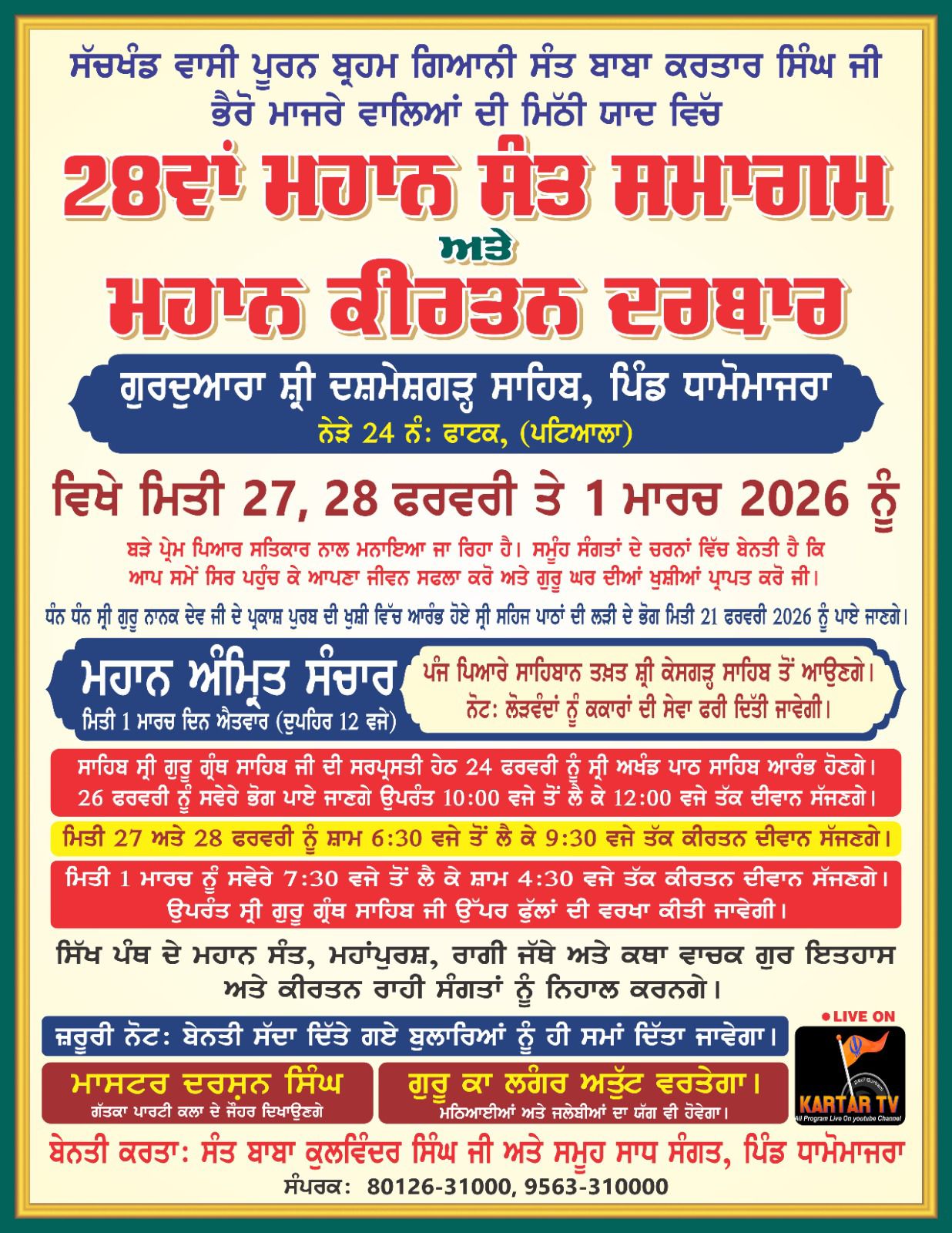 One day Puran Brahmgyani Sant Baba Kartar Singh Ji Maharaj (Bhairon Majre Vale) said that we have to build a place in Patiala. Baba ji along with Sant Baba Kulwinder Singh Ji (Dalla Ji) and one sikh came to a village near Patiala named “Dhamo Majra.” A Sikh from that village came to meet Braham Giyani Sant Baba Kartar Singh Ji and during their talks, Braham Giyani Sant Baba Kartar Singh Ji said,“Bhai Asi Gurudwara Banana” to which the sikh replied that he already had a piece of land where it can be built.